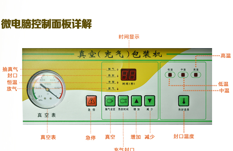 4、當(dāng)抽氣時(shí)間達(dá)到預(yù)設(shè)定時(shí)間時(shí),抽氣結(jié)束,指示燈隨之熄滅,熱封指示燈亮,此時(shí)電磁閥工作,進(jìn)入封口程序,面板上舍友熱封時(shí)間及溫度調(diào)節(jié)按鈕,以適應(yīng)不同厚薄的材料,調(diào)節(jié)時(shí)間及溫度應(yīng)注意一定根據(jù)所需的包裝袋規(guī)格來調(diào)整。