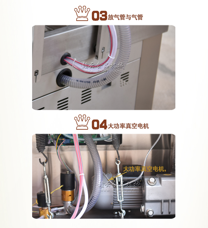 3、壓下真空蓋,面板上的抽氣指示燈亮,真空泵開始抽氣,機(jī)蓋即被自動吸引,抽真空時(shí)間可根據(jù)包裝要求調(diào)節(jié)適當(dāng)時(shí)間。