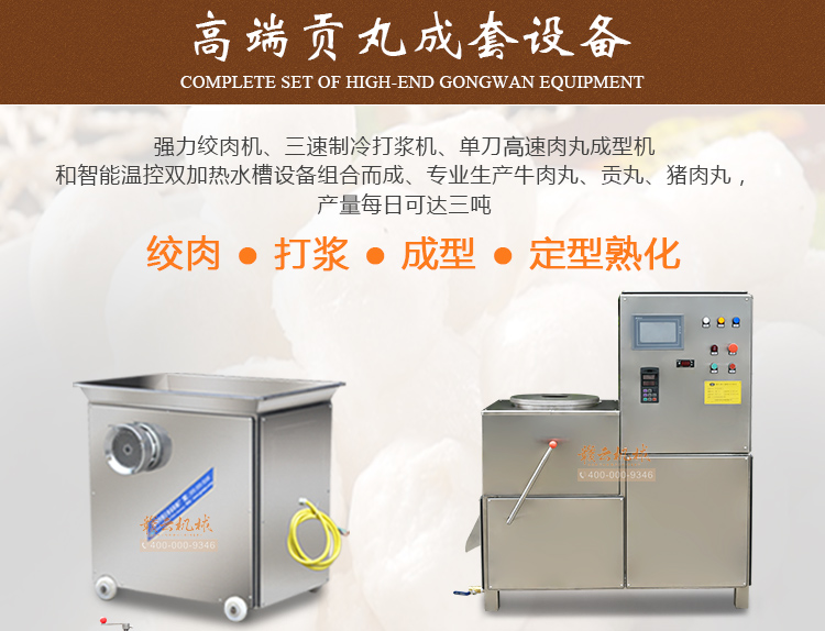 本套設(shè)備由:52型強(qiáng)力絞肉機(jī)、三速制冷打漿機(jī)、單刀高速肉丸成型機(jī)和1500型智能溫控雙加熱水槽設(shè)備組合而成、專業(yè)生產(chǎn)牛肉貢丸,豬肉丸,日產(chǎn)貢丸可達(dá)三噸。