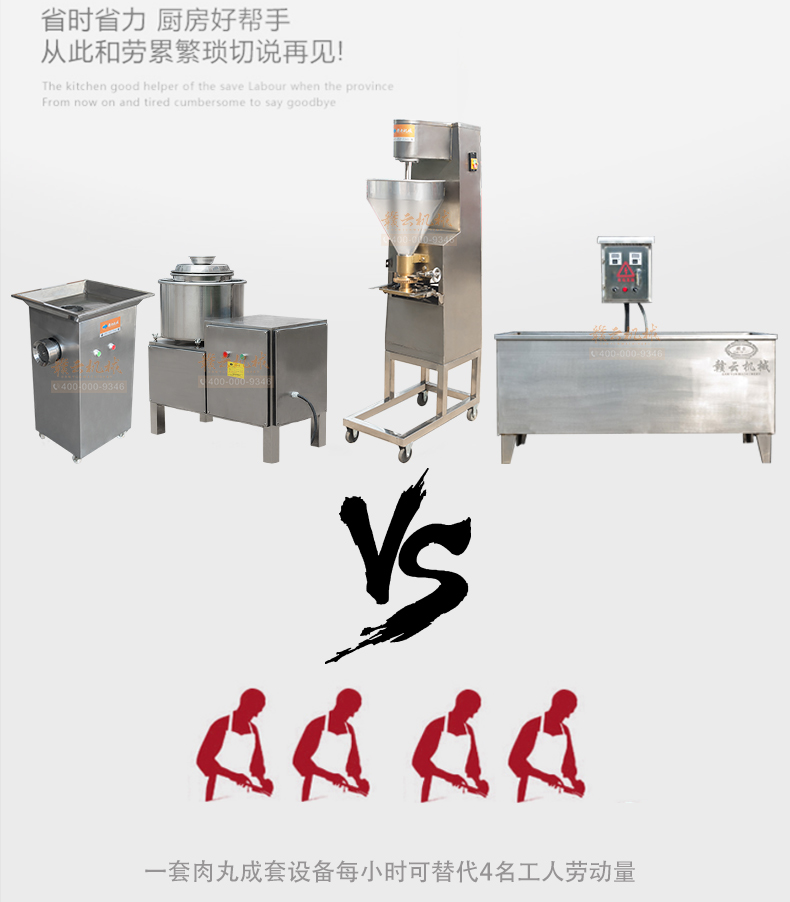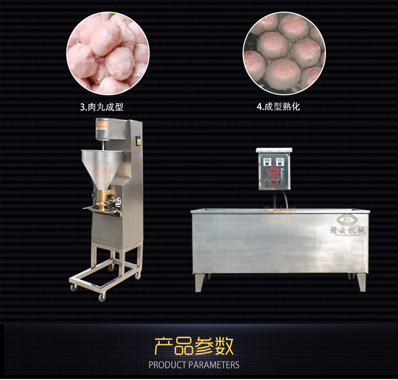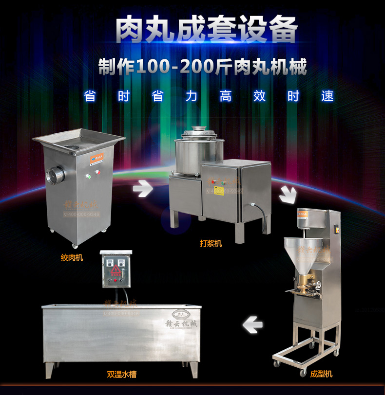本套設(shè)備由32型絞肉機(jī)、28型高速(慢速)打漿機(jī)、加高成型機(jī)、熟化成型設(shè)備(雙溫水槽)4太設(shè)備組合而成,專業(yè)生產(chǎn)實心肉丸,日產(chǎn)100-200斤。需要場地面積:25-30平方米,供電需求:380v(三相電)可選設(shè)備:200采肉機(jī)