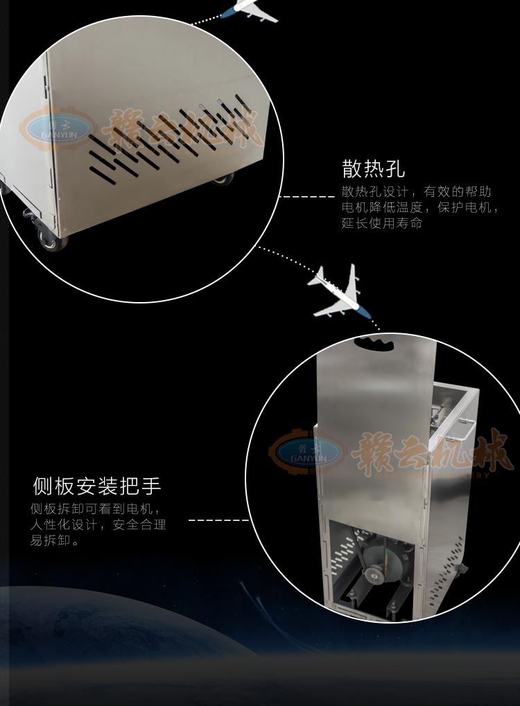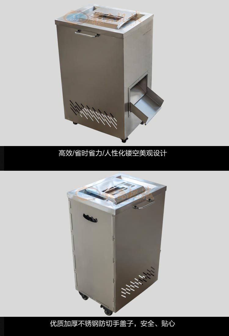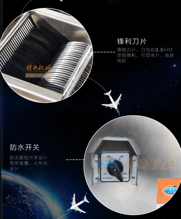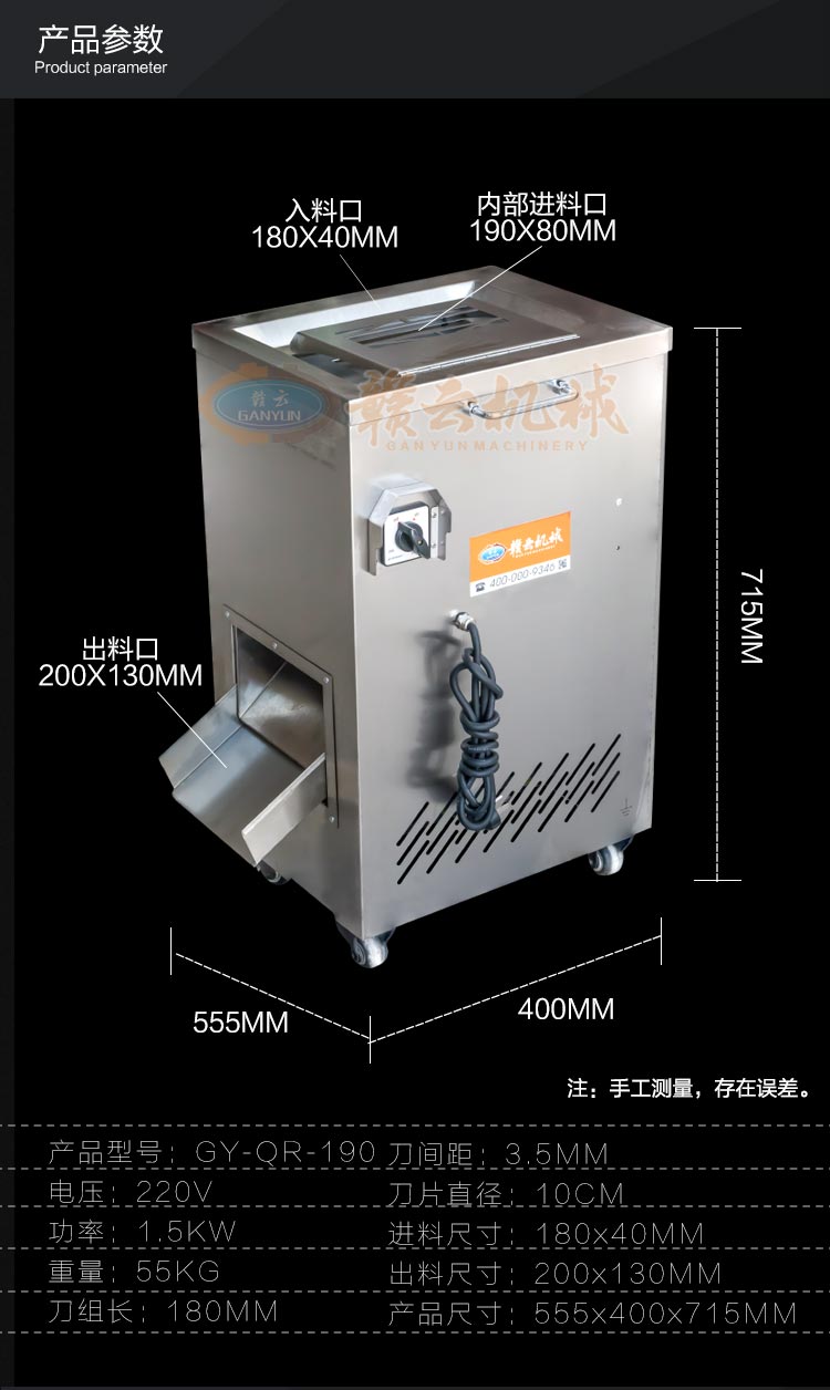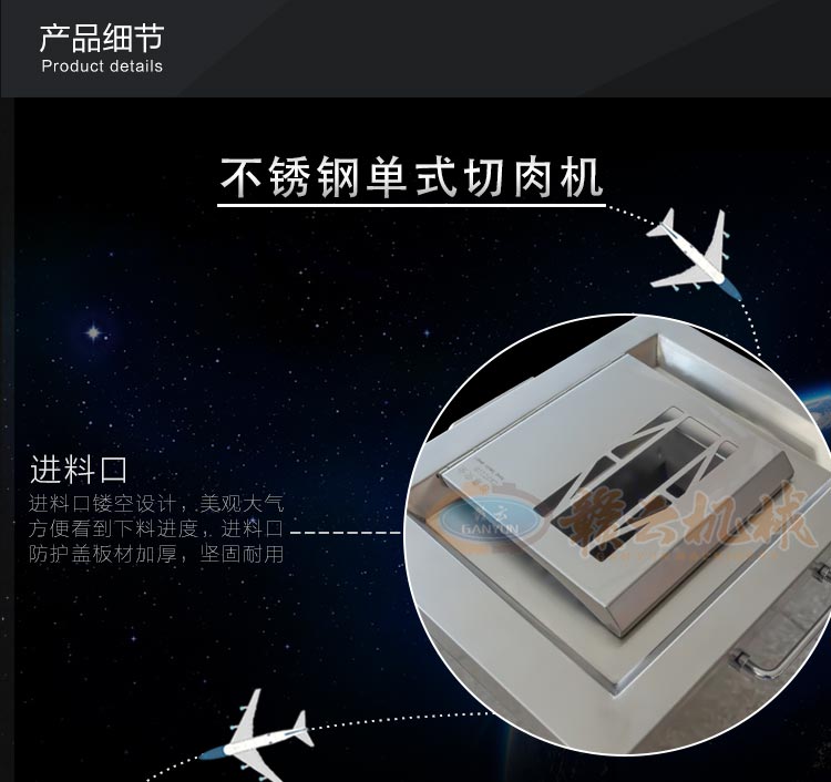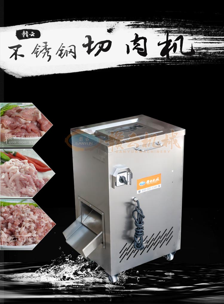 不銹鋼切肉機(jī)不銹鋼切肉機(jī),進(jìn)料口鏤空設(shè)計(jì),方便看到下料進(jìn)度,進(jìn)料口防護(hù)蓋板材加厚,堅(jiān)固耐用。鋒利刀片,刀間距3.5mm,切切肉片、肉絲、肉粒。防水旋鈕開關(guān)。折疊出料口,節(jié)省空間,推回可防止料斗刮壞。側(cè)板拆卸可看到電機(jī)。304不銹鋼機(jī)身,兩個(gè)萬向輪,兩個(gè)非萬向輪,容易固定,省心。