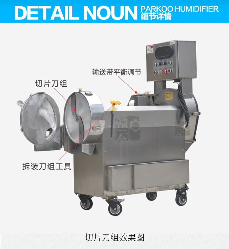 用途:將根莖類蔬菜:馬鈴薯、蕃薯、瓜類、竹筍、洋蔥、茄子以及葉菜類蔬菜:芹菜、大白菜、高麗菜、菠菜等蔬果類切成丁、片、絲條、段、粒狀。