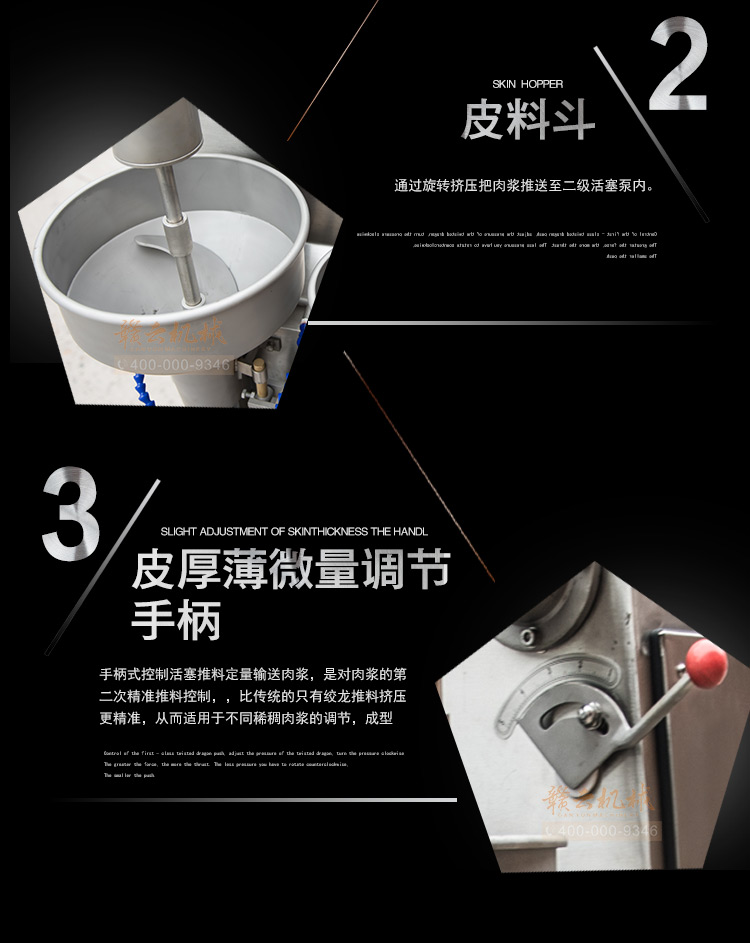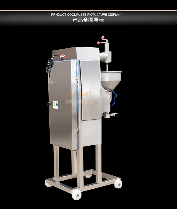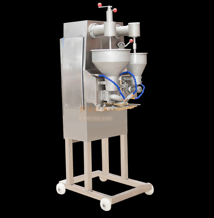 第三代包心肉丸機(jī)是在贛云二代包心肉丸機(jī)的基礎(chǔ)上,對(duì)二代包心機(jī)的成型切割部位進(jìn)行優(yōu)化提速處理,達(dá)到每分鐘200粒的成型速度是二代包心機(jī)的兩倍,且推料控制方式還是選用一級(jí)絞龍推料和二次泵定量輸送相結(jié)合的原理,餡料控制改塑料螺蓋為不銹鋼抗氧化特殊處理螺蓋,餡斗新增絞龍擋板,可有效防止肉餡余留餡斗,更易肉餡的向下擠壓輸送作用,成型旋轉(zhuǎn)齒輪上新增潤(rùn)滑滴管,彌補(bǔ)了二代包心機(jī)成型區(qū)域局部潤(rùn)滑切刀的缺陷,做出的包心包餡丸表皮光滑,個(gè)體圓且大,成型速度快,無小尾巴等優(yōu)勢(shì)。綜上優(yōu)勢(shì)pk二代和目前其他廠家新款式包心肉丸機(jī),故稱之為贛云第三代包心肉丸機(jī)!