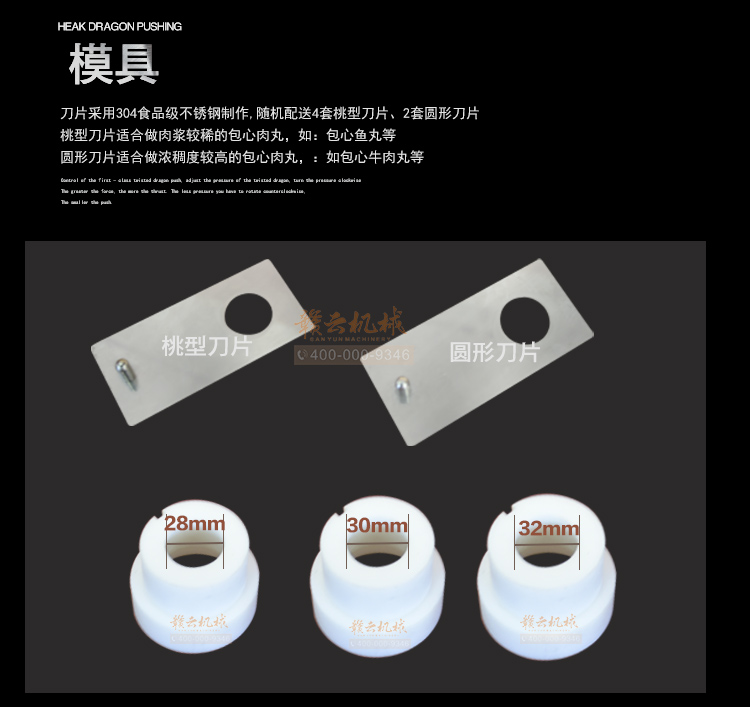 成型模具:28mm、30mm、32mm三種規(guī)格,其他規(guī)格可定做。本機(jī)可生產(chǎn)直徑為28mm-36mm直徑的包心丸子,因此定做的規(guī)格直徑不能超過36mm,也不能低于28mm.