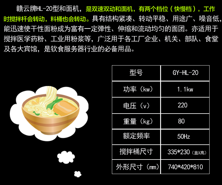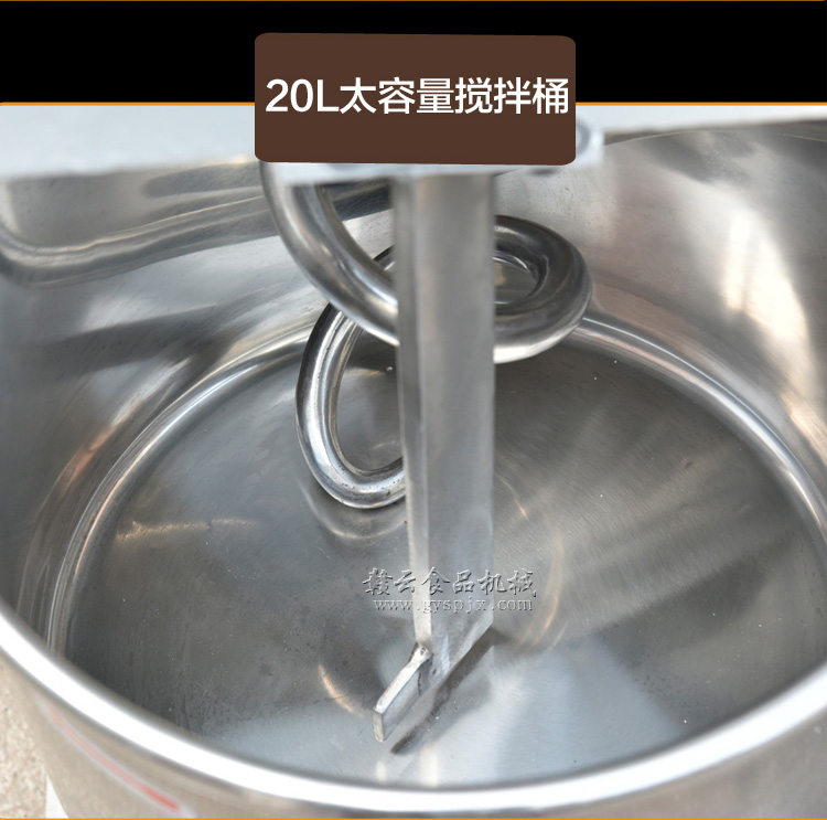贛云牌HL-20型和面機,立式雙速雙動型和面攪拌機,有兩個檔位(快慢檔),工作時攪拌桿會轉(zhuǎn)動,料桶也跟隨轉(zhuǎn)動。具有結(jié)構(gòu)緊湊、轉(zhuǎn)動平穩(wěn)、用途廣、噪音低,能迅速使干性面粉成為富有一定彈性、伸縮和流動均勻的面團。亦適用于攪拌醫(yī)學(xué)藥粉、工業(yè)用粉漿等,廣泛用于各工廠企業(yè)、機關(guān)、部隊、食堂及各大賓館,是飲食服務(wù)器行業(yè)的常見用品。我廠常規(guī)批量生產(chǎn)供應(yīng)的雙速雙動和面攪拌機有20L和30L兩種型號,如需更大規(guī)格可定做,如60L、80L,歡迎來電咨詢:電話0797-8373422