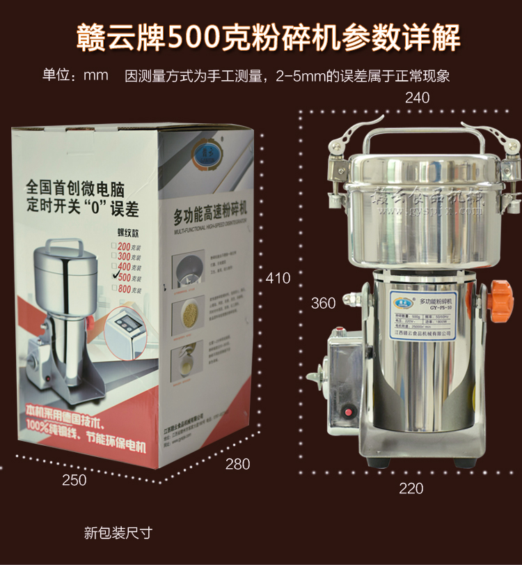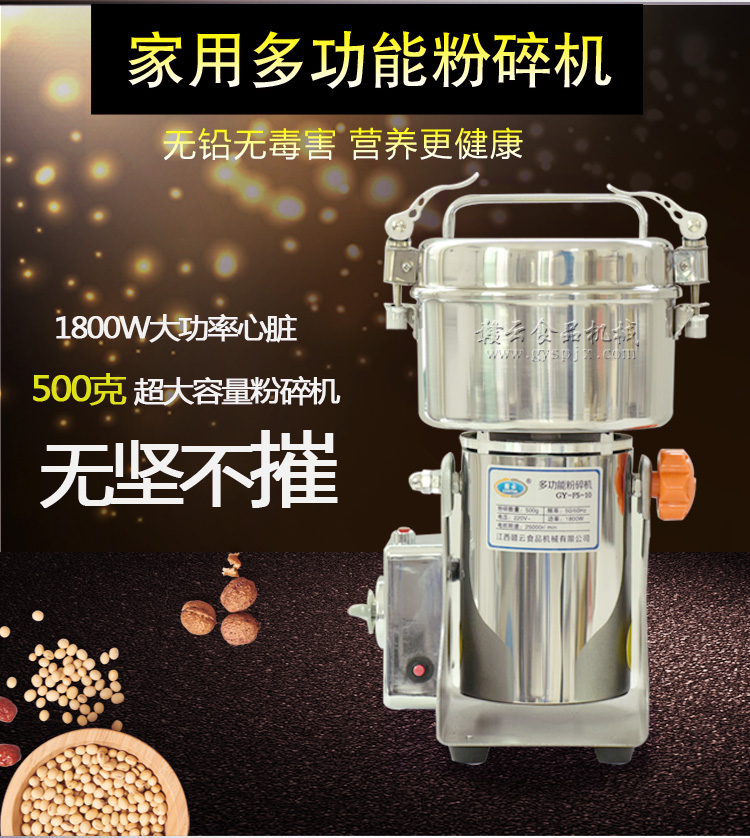 贛云系列多功能粉碎機采用純銅高速電機帶動粉碎刀片將物料快速打成粉末,可用于粉碎五谷、雜糧、田七、阿膠、白叁等,一般粉碎時間1-2分鐘即可,新款粉碎機改保險絲為空氣過載保護器,使用更安全,我廠提供的粉碎機有100克-1000克不同型號的多功能粉碎機。