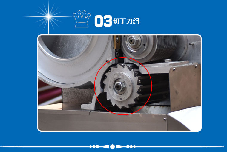 工作原理:gy-dq-130型切丁機(jī)通過旋轉(zhuǎn)撥盤將被切物體帶動高速旋轉(zhuǎn),利用物體的離心力,立刀將物體切成片狀,然后經(jīng)過圓盤切絲刀片豎切成條狀,并將條狀物送入橫切斷刀口,由橫切斷刀盤切刀切成所需的長方體或立方體。