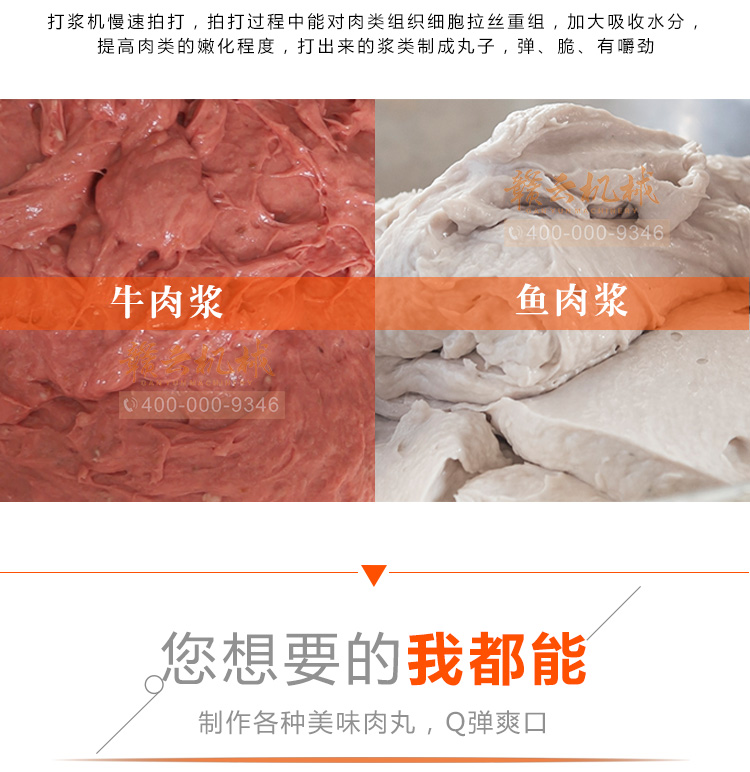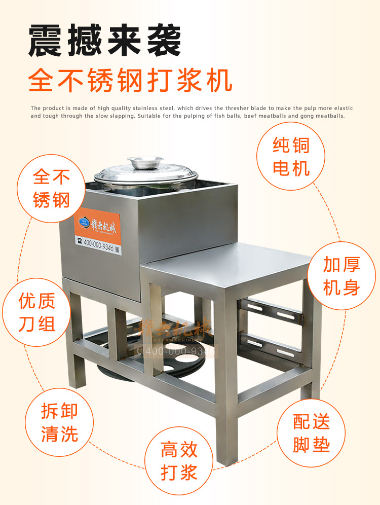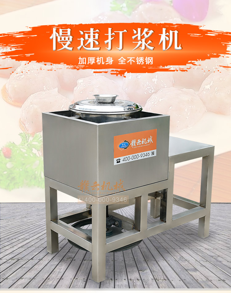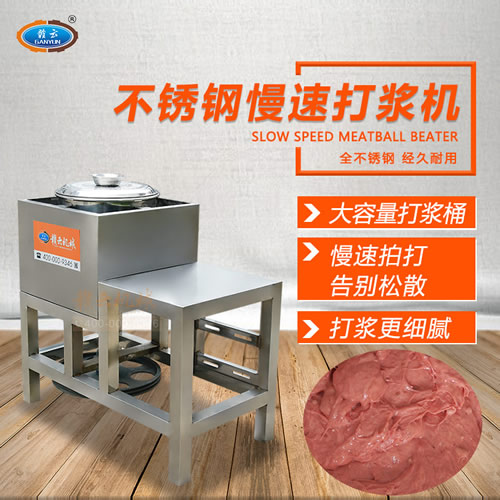 贛云牌全不銹鋼慢速魚丸、肉丸打漿機采用優(yōu)質不銹鋼材質,通過大皮帶輪減速帶動打漿機刀片打漿,通過慢速拍打,使肉漿更具有彈性和韌性。適合魚丸、牛肉丸和貢丸的制漿之用。
