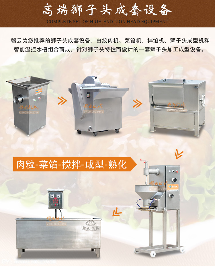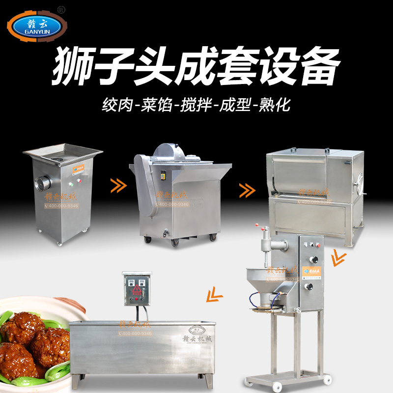 獅子頭成套設備組合,贛云為您推薦獅子頭成套設備,本套設備 由絞肉機、菜餡機、拌餡機、獅子頭成型機和智能溫控水槽組合而成,針對獅子頭特性而設計的一套獅子頭加工成型設備。