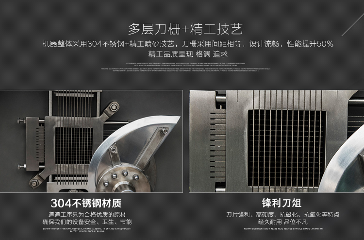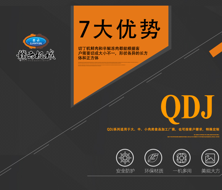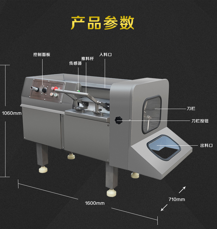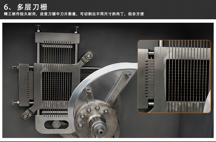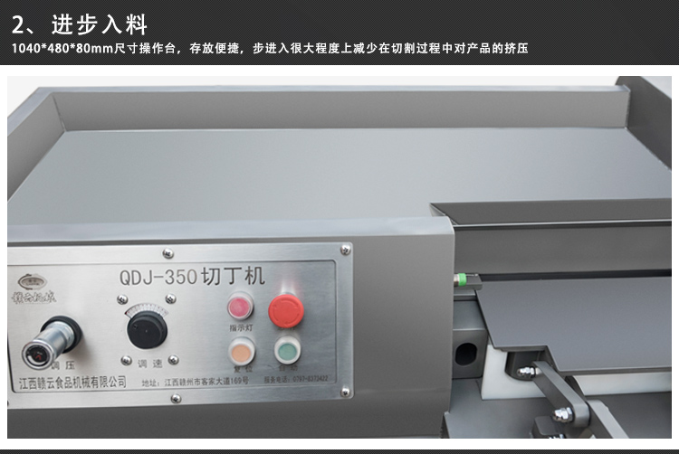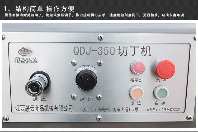 贛云350型切肉丁機,采用304不銹鋼噴砂處理技術(shù),裝備優(yōu)質(zhì)刀組,利用流水線條設(shè)計,配合激光雕刻控制面板,整體外形美觀大氣。液壓步進式推料自動切割,推料速度旋鈕可調(diào),拆增刀片可切出多種規(guī)格肉丁、肉條、肉片。是肉類食品加工切丁專用設(shè)備。