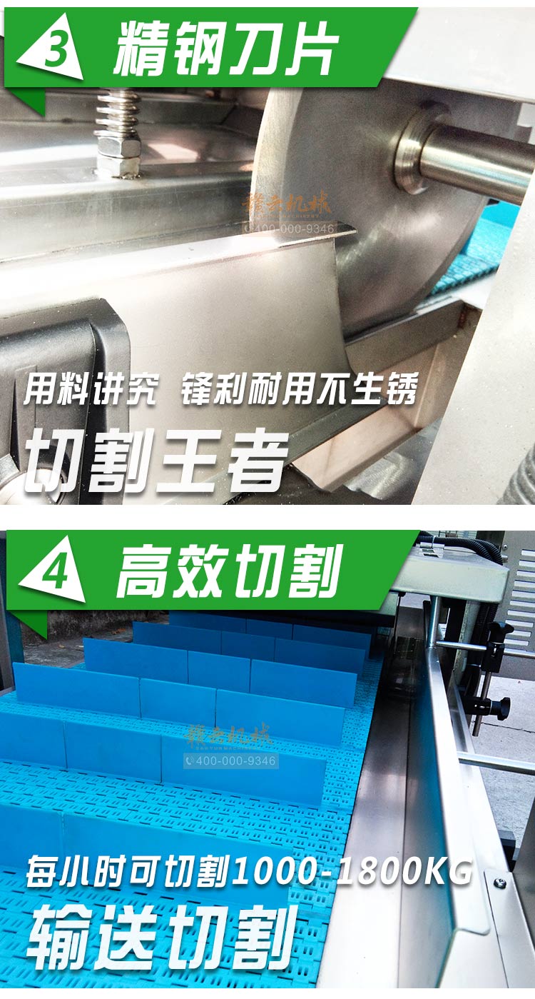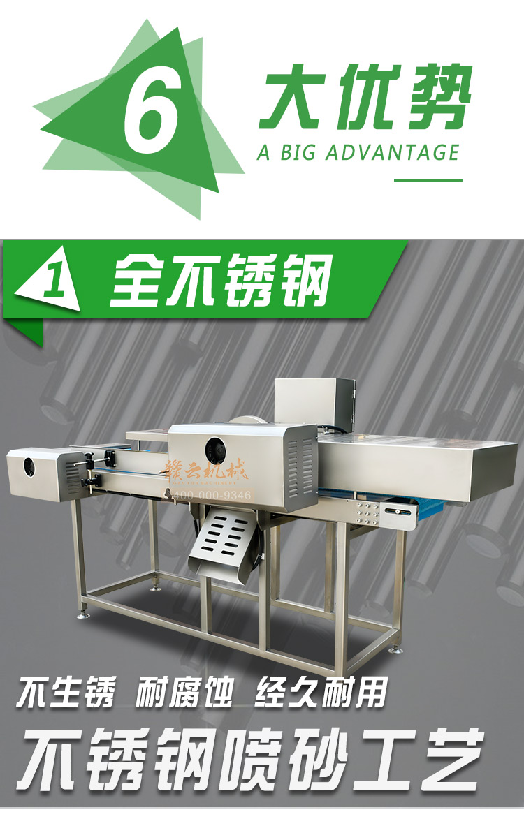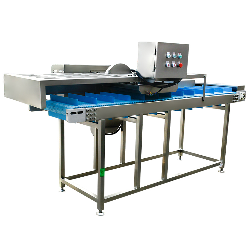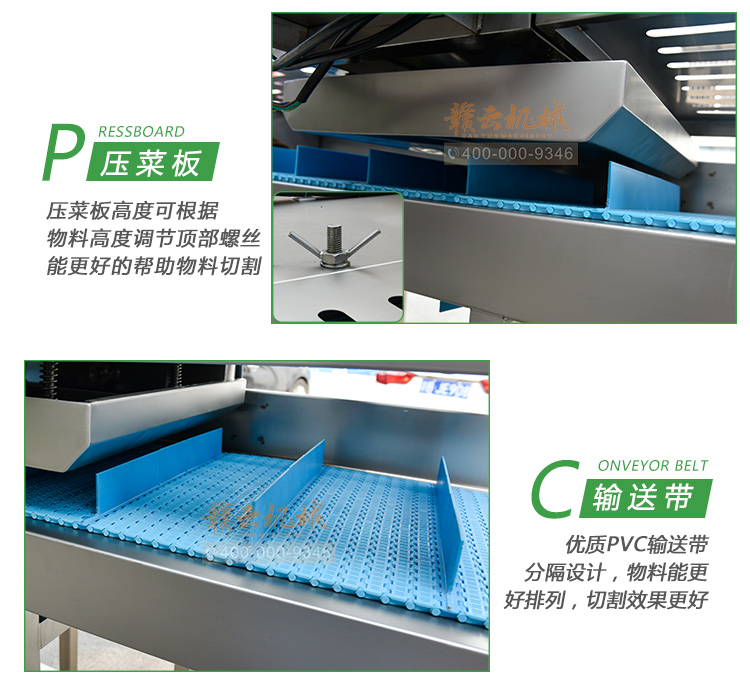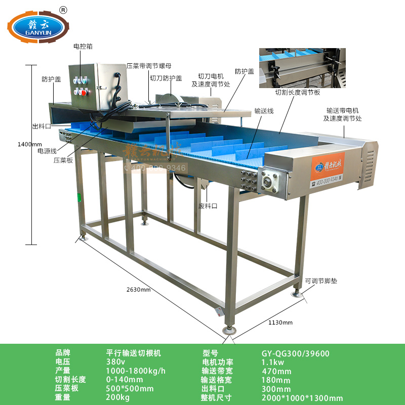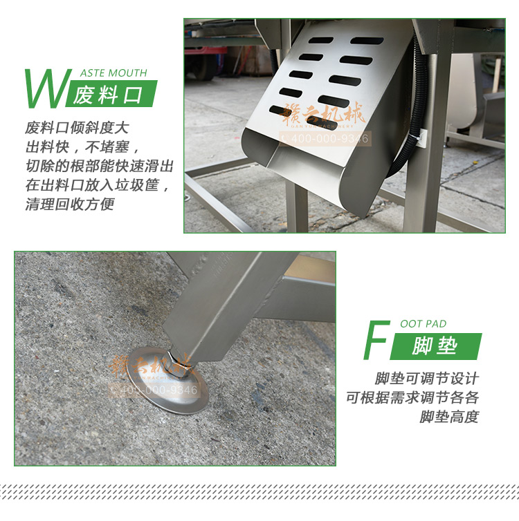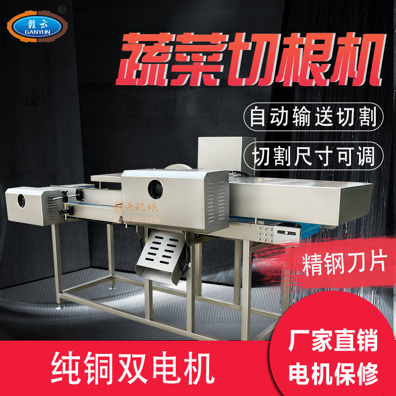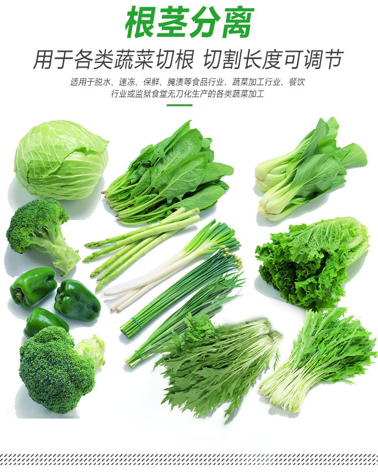 平行輸送去根機由輸送板帶動物料前行,蔬菜經(jīng)過固定位置的刀盤后,蔬菜根部被切割從廢料口出來,保留的蔬菜則向前輸送。切割的長度可以調(diào)節(jié),每顆蔬菜所切割出來的廢料都相等。去根機適合大型食品加工廠、凈菜生產(chǎn)線等。
