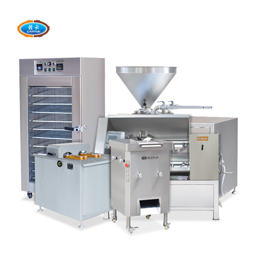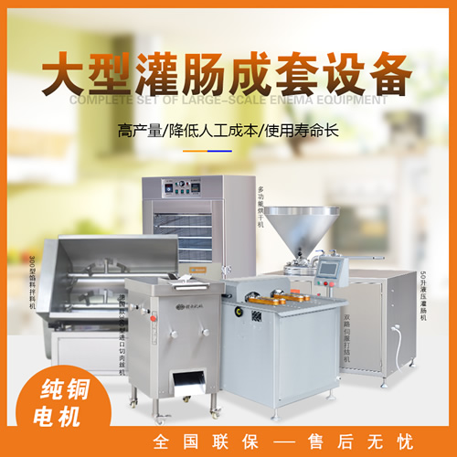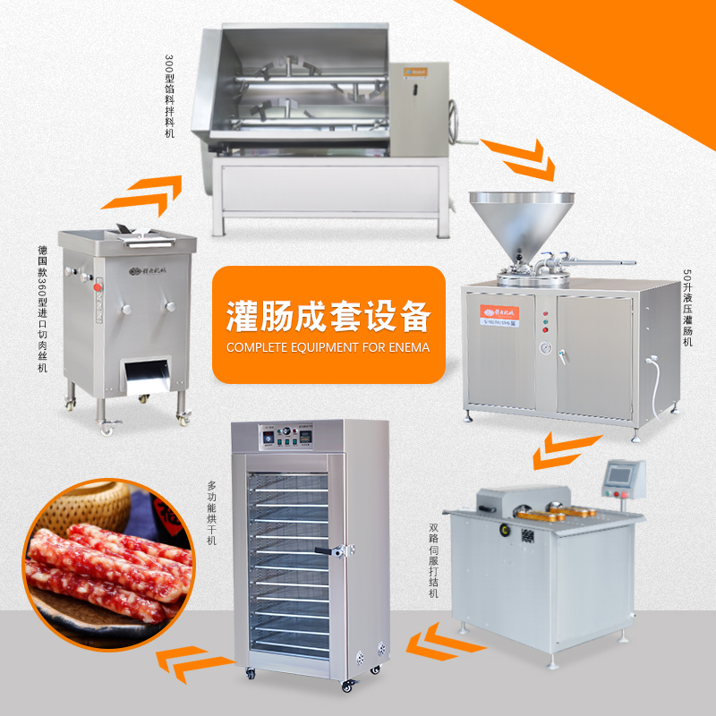 針對本地腸、臘腸、香腸、廣式香腸等生產(chǎn)加工設(shè)備,整套包含切肉機、拌餡機、灌腸機、扎線機、烘干機。