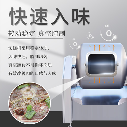 300升智能真空滾揉機,機器工作原理是通過滾筒快速滾動,讓筒里的肉料翻轉、撞擊、使肉均勻的吸收,快速腌制入味,使用真空翻轉是不易損壞肉質的,并且增加肉的結合力,提高肉的彈性,可以改善肉的口感更容易入味,讓肉料腌入骨,用真空滾揉機做美味。