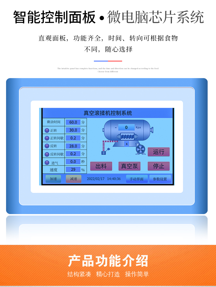 機器使用大功率電機,揉滾雙向轉動,采用不銹鋼機身,擁有智能控制面板,讓功能更直觀展示,時間、轉向可以根據食物不同,隨心選擇。