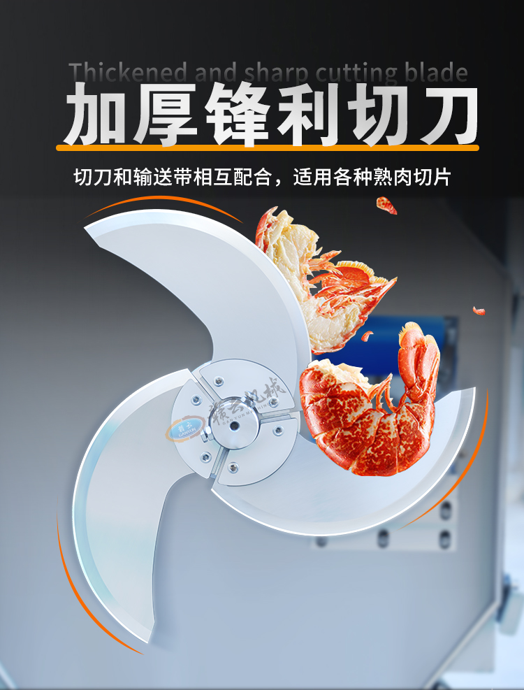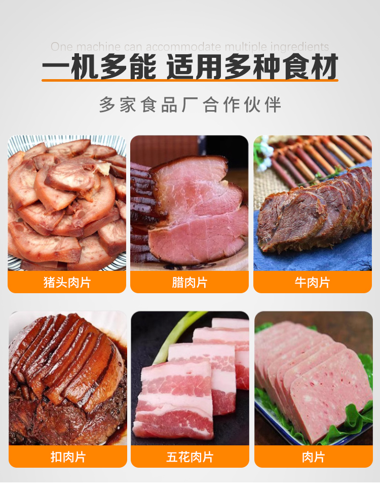 用于豬頭肉、臘肉、牛肉、扣肉、五花肉、火腿等快速切片切段,適應(yīng)多種食材。