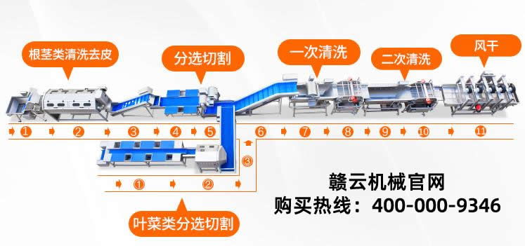 雙用凈菜加工流水線也可以叫多功能凈菜加工流水線,這條流水線設計出來的目的是針對產(chǎn)能過剩但又需要加工清洗不同種類的蔬菜。例如在中央廚房配餐中心,每日只有2000人份蔬菜,需要清洗切割的蔬菜有葉菜類、球根徑類這兩類,如果單單使用一條葉菜類凈菜加工流水線時,會導致葉菜加工線的產(chǎn)能過剩,讓整條葉菜加工線啟動沒多久后就已經(jīng)將當天需要的葉菜清洗完成。