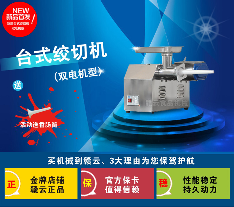 臺(tái)式電動(dòng)絞肉機(jī)的設(shè)計(jì),可以放在桌上,絞肉機(jī)占地面積小,使用方便,可供您的需求選擇各種型號(hào)的絞肉機(jī),采用高級(jí)的不銹鋼材料,堅(jiān)固耐用,質(zhì)量高,故障率低,維修方便快捷的大型絞肉機(jī)、自動(dòng)絞肉機(jī)適合任何賓館、餐廳、飯店、食堂絞制肉泥,主要是通過(guò)螺桿交料斗中的原料肉推擠到絞刀箱中的預(yù)切孔板處、電動(dòng)絞肉機(jī)利用轉(zhuǎn)動(dòng)的切刀刃和孔板上孔眼刃形成的剪切作用將肉切碎,并在螺桿擠壓力的作用下,將肉粒不斷排出孔板處,鮮肉絞肉機(jī)頭部及盛肉托盤(pán)可以很方便的拆卸,全自動(dòng)絞肉機(jī)造型優(yōu)美,精細(xì)研磨設(shè)計(jì),清洗方便、質(zhì)量上乘、價(jià)格低,廠家直銷,深受全國(guó)用戶的青睞和支持,更大的絞肉機(jī)可以來(lái)電咨詢?cè)斍椤?/FONT>