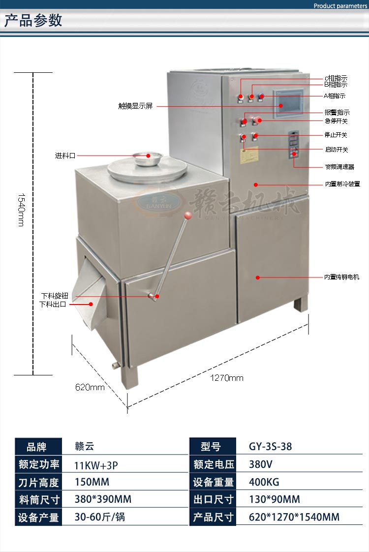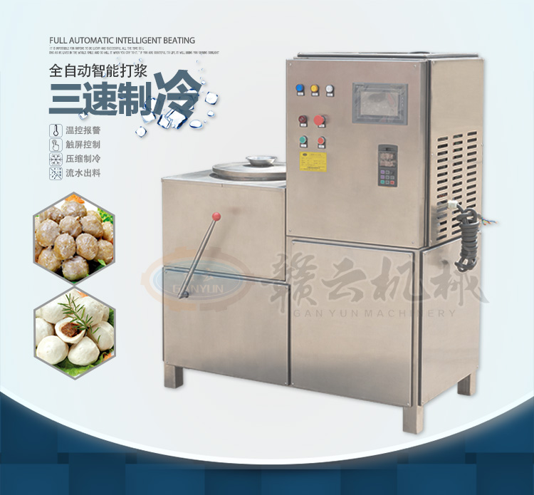 贛云三速制冷打漿機,采用智能操控系統(tǒng) ,根據(jù)原料的不同選擇不同的速度進行打漿,三種速度配備三種刀組,分別是高速打漿刀,中速打漿刀和低速打漿刀。三機合一不僅占地面積小,集可視化觸屏操作、預設打漿時間、溫控感應系統(tǒng)、超負荷停機報警系統(tǒng)、流水式搖桿控制出料,并配備大功率的壓縮制冷系統(tǒng),效果快速,十分鐘就能達到想要的制冷效果,很好的保證了肉漿的鮮度。