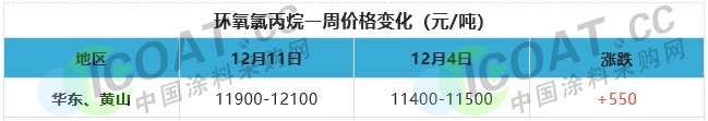 國(guó)內(nèi)環(huán)氧氯丙烷市場(chǎng)止跌反彈,12月11日,華東市場(chǎng)環(huán)氧氯丙烷價(jià)格在12000元/噸附近。聽(tīng)聞寧波環(huán)洋兩條線共6萬(wàn)噸/年甘油法環(huán)氧氯丙烷裝置負(fù)荷穩(wěn)定,廠家新單暫無(wú)明確報(bào)盤,廠家計(jì)劃15日開(kāi)始停車,約25天。