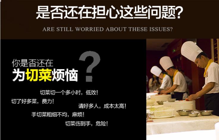對于飯館,酒店,商業(yè)廚房等來說,切菜的數(shù)量龐大,使用人工不緊效率低,而且在長時間的切菜過程人,人的體力,注意力都會下降,導(dǎo)致容易受傷,而受傷不緊影響整體運行,又耽誤工作,對于廚房工作者來說,都希望在短時間內(nèi)將工作做好,但速度快了又怕出錯遭殃。