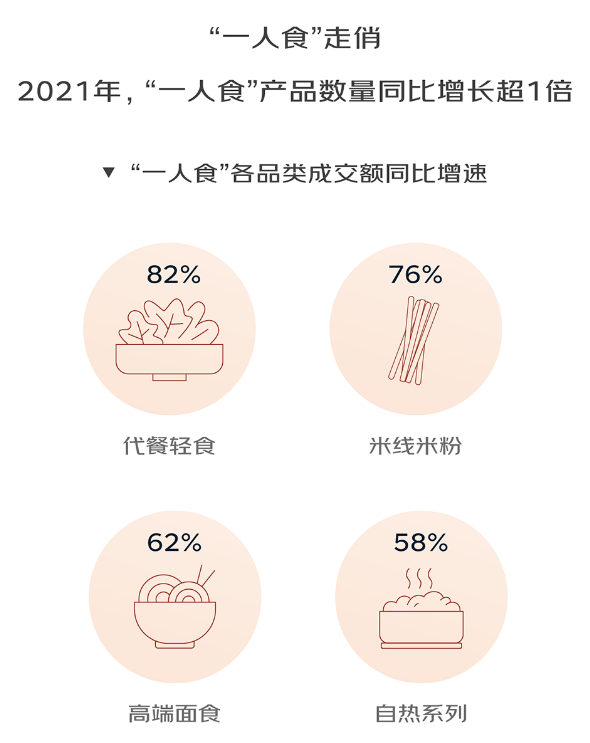數(shù)據(jù)顯示,2021年代餐輕食品類成交額同比增長82%,同時女性群體的兒童速食成交額同比增長78%。所以,建議新入局企業(yè)可聚焦這類需求,在產(chǎn)品設計上突出健康和便捷,通過短視頻等新型消費渠道精準對接這些消費者。